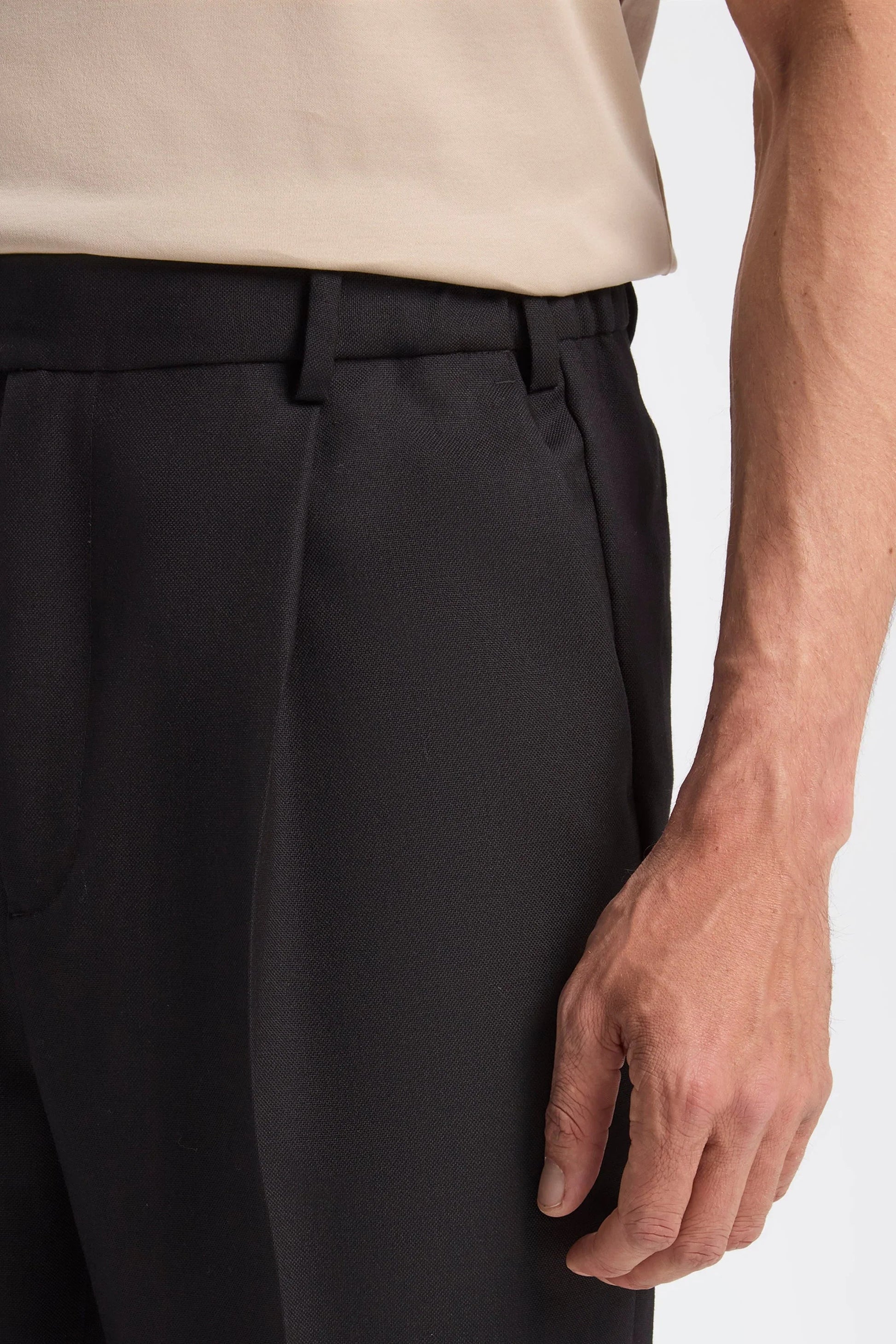 Entdecken Sie unsere weit geschnittenen Hosen, gefertigt aus einem hochwertigen 50/50-Wollmix für perfekten Struktur und Fall. Diese stilvollen Hosen sind mit einem verlängerten vorderen Bund und eleganten falschen Hornknopfverschlüssen ausgestattet.